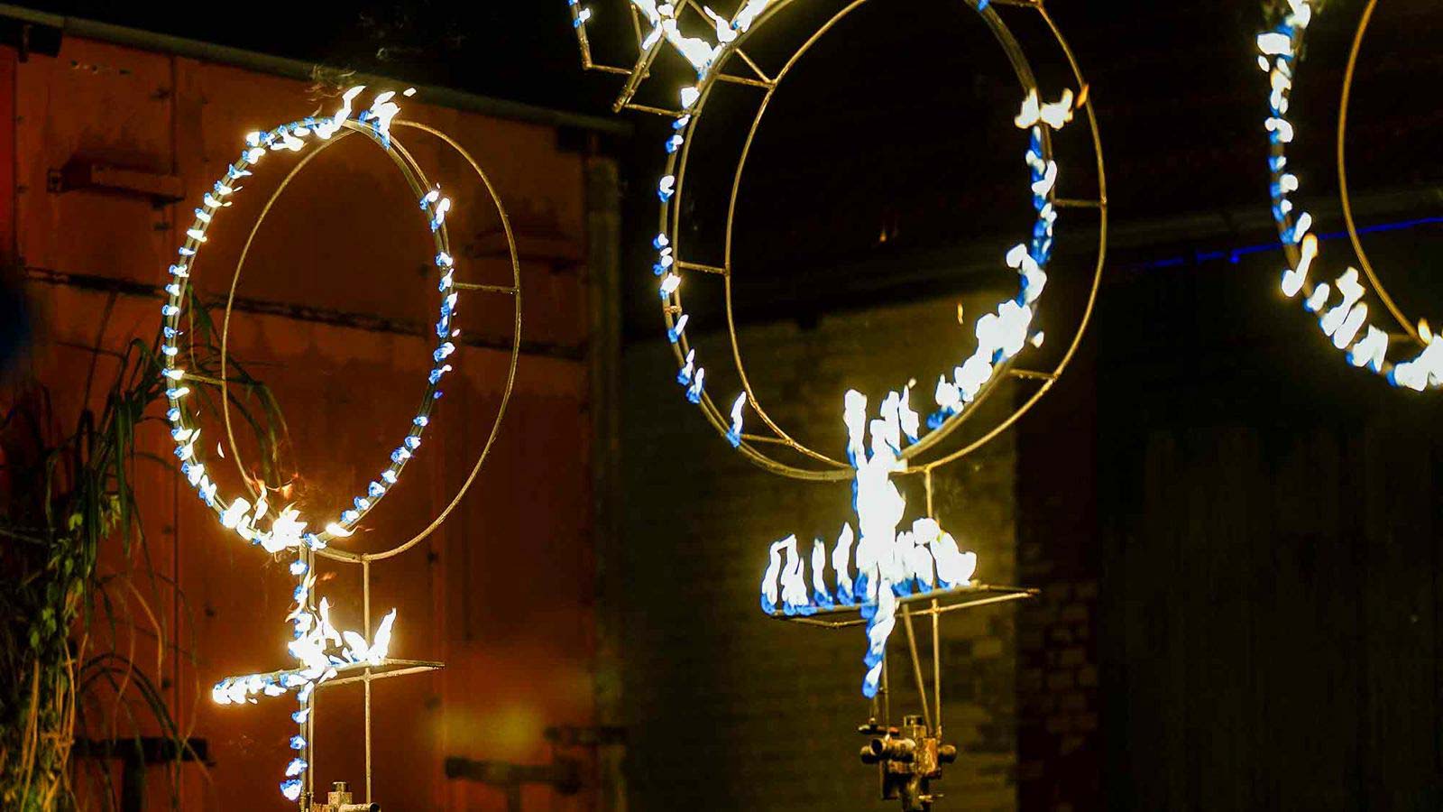 „Feuer und Flamme: Performance-Künstlerin Simone aus Harsewinkel (Greffen) und Schützenbruder Nicolas aus Rheda-Wiedenbrück (Batenhorst) brennen für ihre jeweilige Leidenschaft. Mögen ihre Charaktere noch so unterschiedlich sein – gemeinsam stehen sie für eine kontrastreiche Mischung aus Kunst, (Sub-)Kultur und Traditionen. Und das macht das Zusammenleben im Kreis Gütersloh so spannend.“