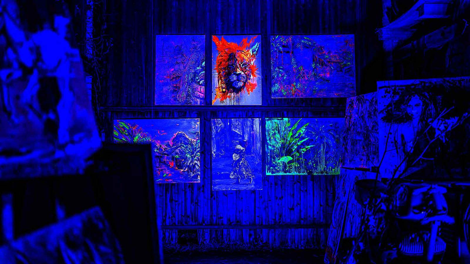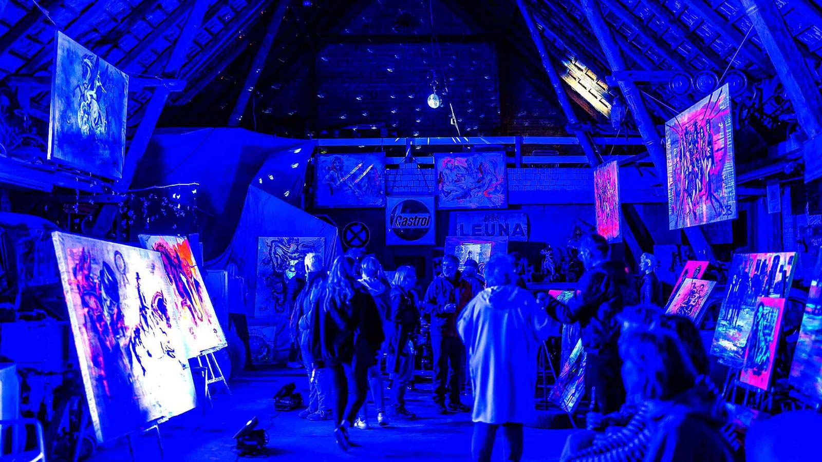 Zur Zeit des Bundeschampionats, bei dem alljährlich die besten Nachwuchspferde Deutschlands ermittelt werden, präsentierte Simone Beckmann eine Auswahl ihrer Pferdebilder in der ebbers-Galerie in Warendorf. Darunter auch „Olympic Dreams“, das großformatige, erst später um wesentliche Elemente ergänzte Olympiabild. Es stellt die deutschen Reitsport-Sieger von Paris 2024 dar: Jessica von Bredow-Werndl, Michael Jung, Christian Kukuk, Frederic Wandres und Isabell Werth. Auch Mäzenin Madeleine Winter-Schulze ist abgebildet. Während der dreimonatigen Ausstellung wurden ihre Bilder effektvoll beleuchtet. „Das Licht war so eingestellt, dass es mal ganz hell und mal ganz dunkel wurde“, erläutert Simone Beckmann. Im Wechsel vom Tageslicht zu den in der Dunkelheit aufleuchtenden neon-expressiven Farben konnte sich deren Potenzial voll entfalten. Das für den Menschen unsichtbare UV-„Schwarzlicht“, das durch spezielle Lampen erzeugt wird, regt die fluoreszierenden Farbstoffe zum Leuchten an. Die Bilder bekommen dadurch eine fast dreidimensionale Wirkung. Magisch anmutendes „Blaue-Stunde-Licht“ und intensives Farbglühen entführt die Betrachtenden in eine verzauberte Welt.