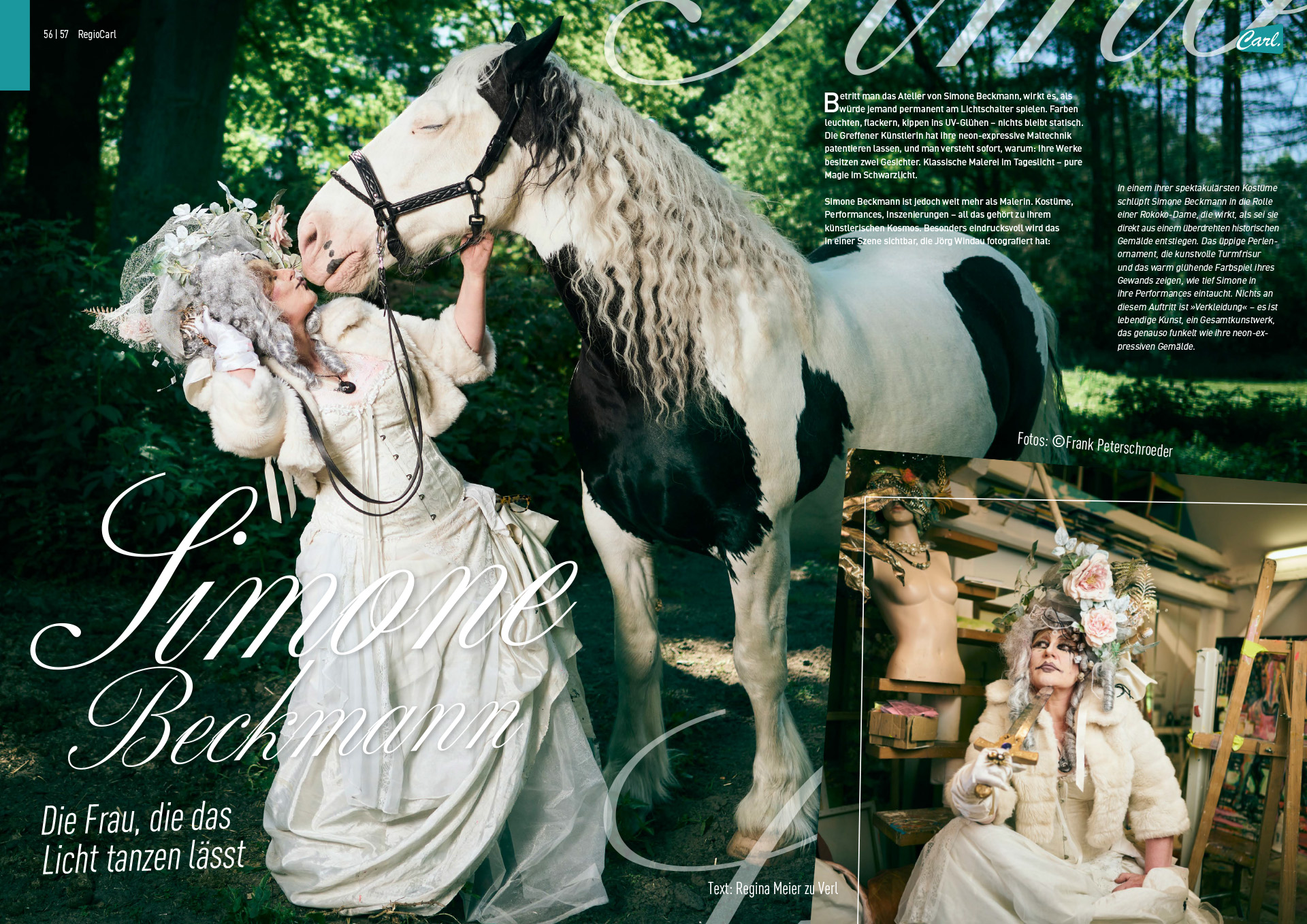 „Ich bin eine Busch-Reiterin, ein naturverbundener Wildfang, so ’ne kleine Pippi Langstrumpf, habe aber auch kein Problem damit, in Latex und Plastik zu schlüpfen“, erklärt die vielseitige Künstlerin, die sich mit einem Augenzwinkern immer wieder neu inszeniert. Die Kraft und Wildheit der Pferde, vereint mit Schönheit und Eleganz, bringt sie mit ihrer neon-expressiven Maltechnik auf facettenreiche Weise zum Ausdruck. Das kommt bei der Reitsport-Prominenz gut an. Für die nächste Veranstaltung „Horses & Dreams“ sei sie bereits angefragt worden und habe „noch ganz viele Bilder geplant“, freut sich Beckmann. „Ich hab’ immer so viele Ideen, soviel Lebenszeit gibt es gar nicht!“, so die Künstlerin lachend. Die Paletten mit neuen Leinwänden sind just eingetroffen. Nun kann es losgehen mit der Umsetzung.